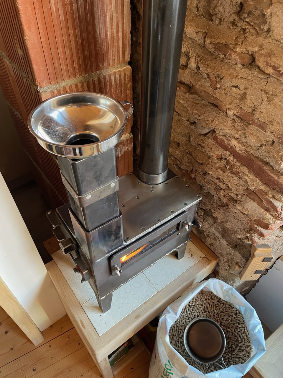 Pas plus gros que deux grosses boîtes à chaussures et avec : un four à cake, un four à pizza, une plaque de cuisson, des briques d’inertie et un fonctionnement bois et granulés !